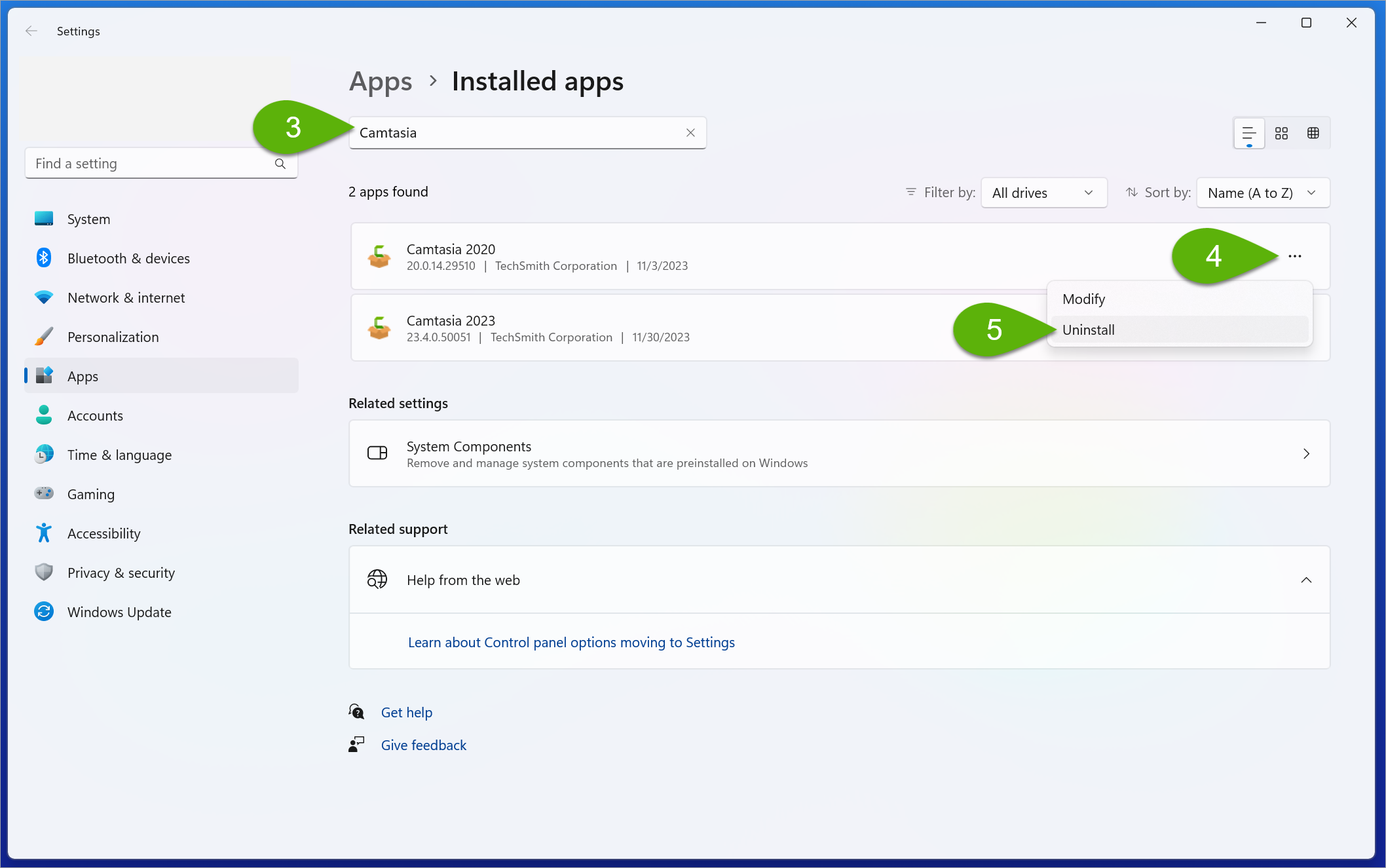 - Geben Sie den Namen des TechSmith-Produkts ein, das Sie deinstallieren möchten.