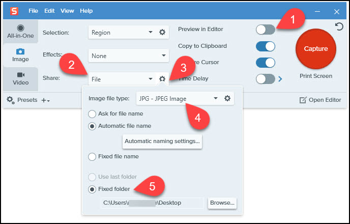 - Öffnen Sie die Snagit Capture-Anwendung und stellen Sie Ihre Aufnahme-Einstellungen wie hier gezeigt ein: