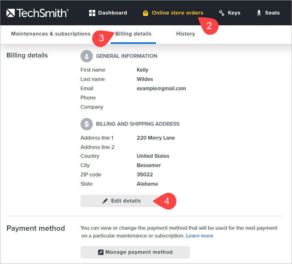 - Go to Billing details. You can view the details that you entered during your newest order.