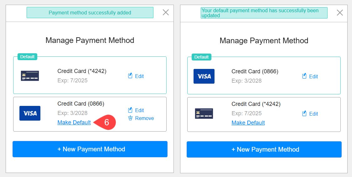 - Once you add a new payment method, next to it, select Make Default. It will now be used for any future charges on your subscription.