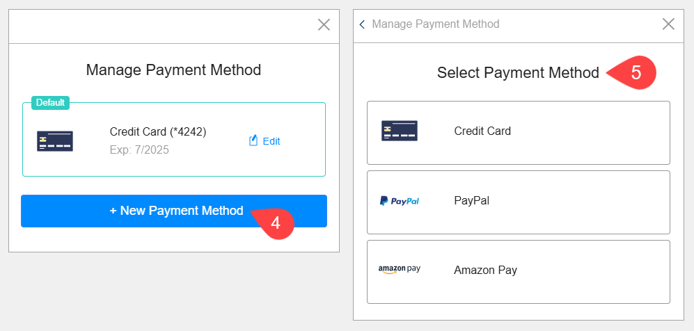 - Add a new credit card, or link your PayPal or Amazon Pay account.