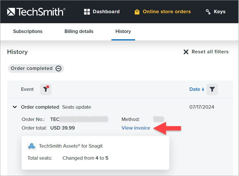 If you purchased directly from TechSmith and have the original receipt, you can locate your key under Software Key below the product that you are looking for.