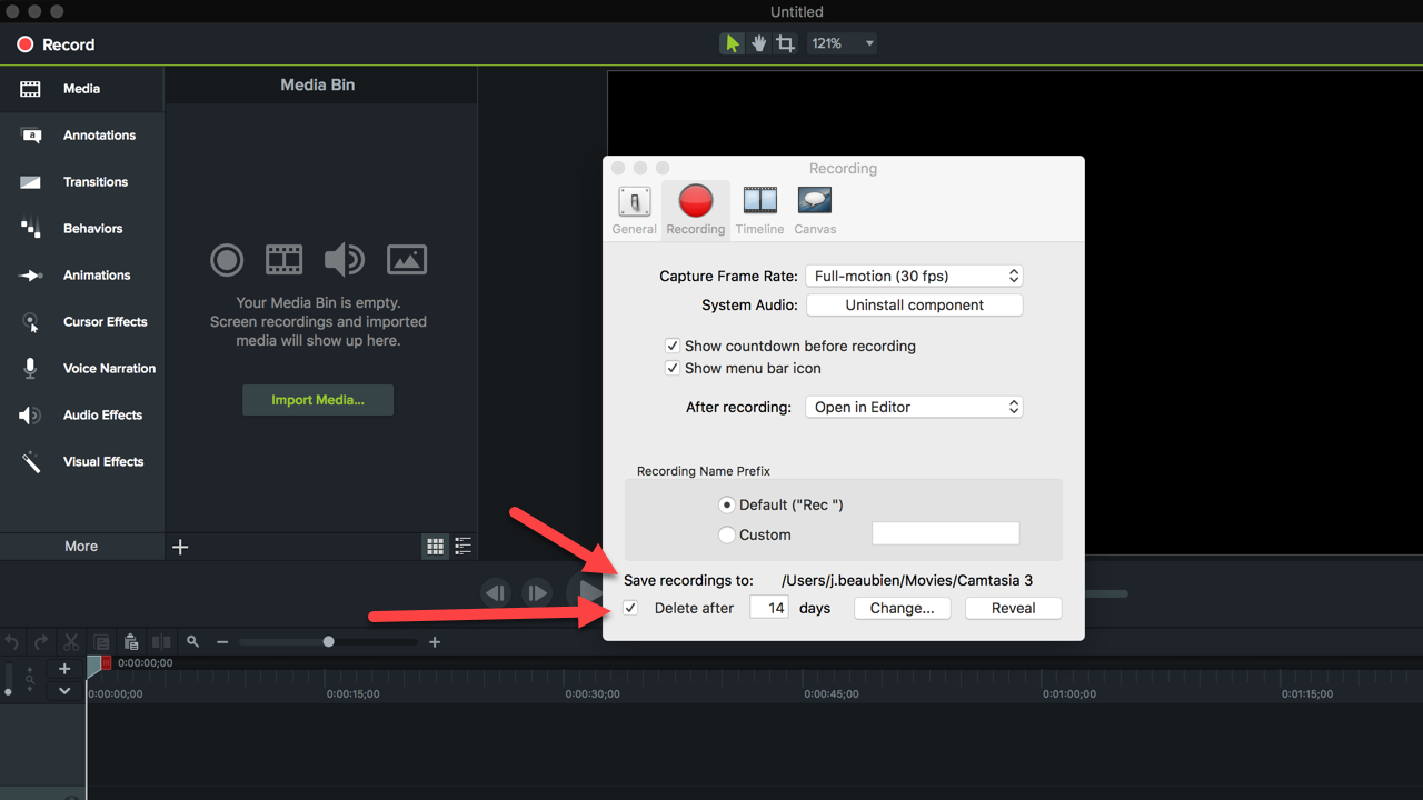 Recordings are automatically deleted after 14 days by default if not used in the project. You can change the auto delete period or deselect it if you do not want Camtasia Editor to delete recording files. Follow these instructions to change auto delete: