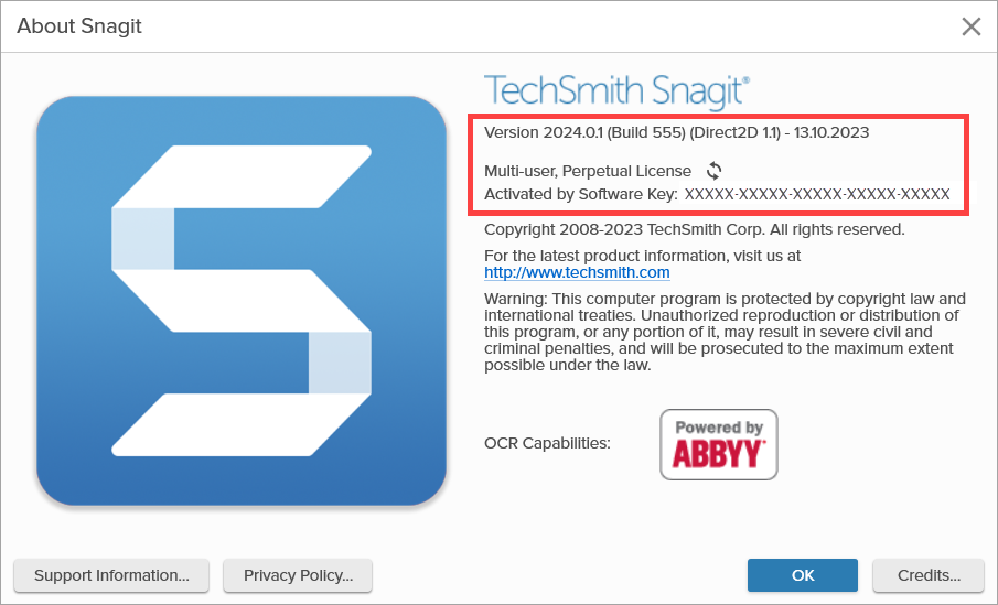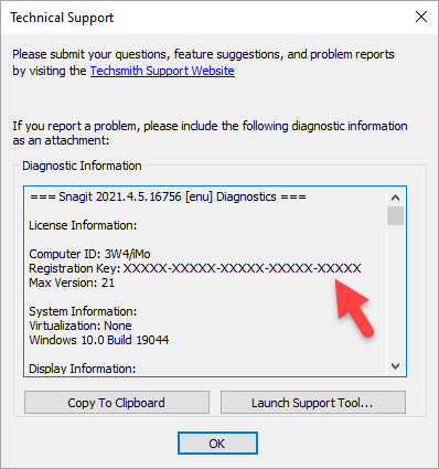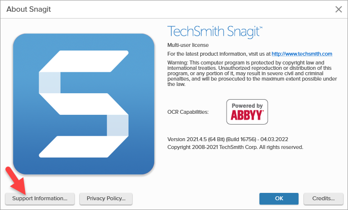 - Select File > Help > About Snagit > Support Information.