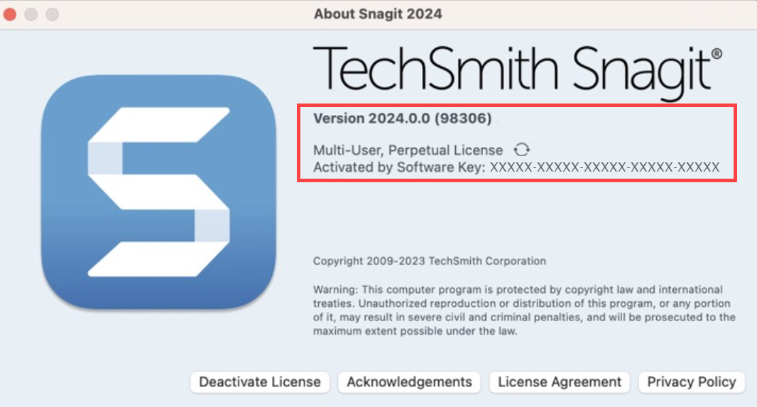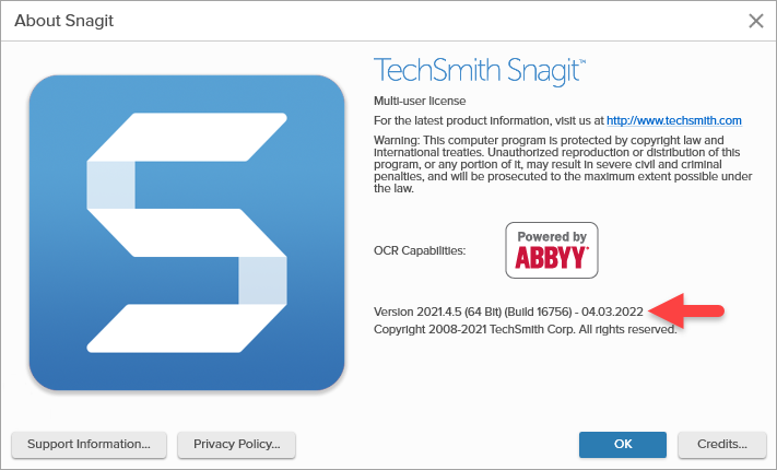 - In the About Snagit window, you can view your software Version.