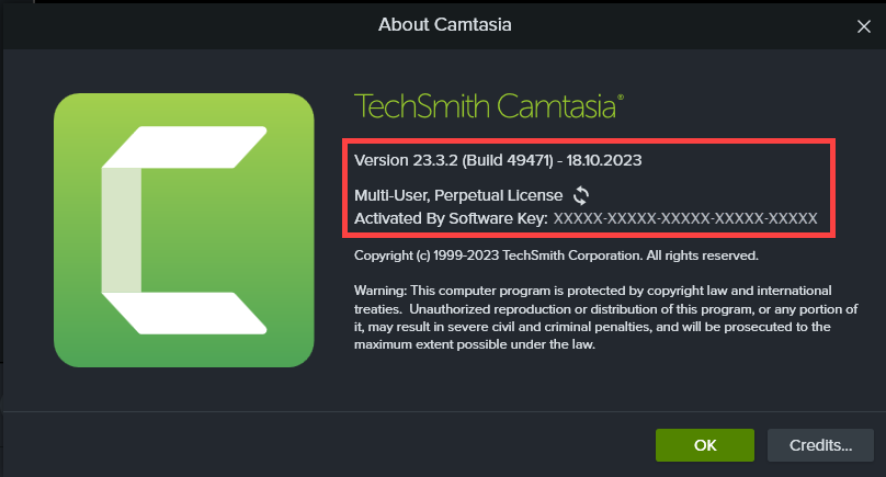 - In the About Camtasia window, you can view your software Version and Software Key (25 characters comprised of letters and numbers).