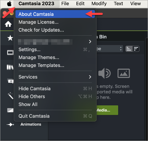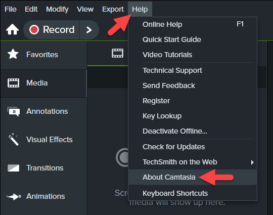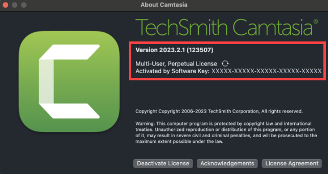 - Select Help > About Camtasia.