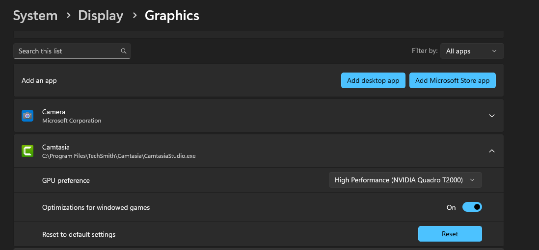 If updating your drivers does not work, try creating custom graphics settings for Camtasia:
