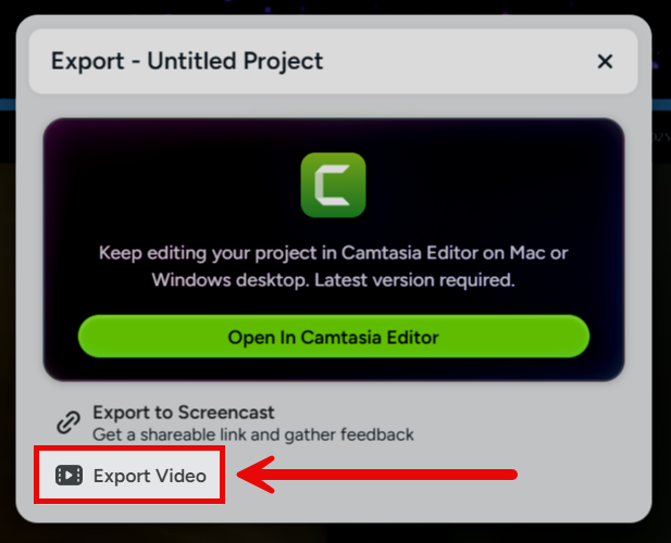 Additionally, if you are a Camtasia Editor account holder then you can export the Camtasia online project to Camtasia Editor and continue editing and/or export to MP4.