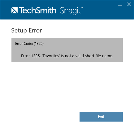 The Snagit installation fails with the error "Error Code: (1325) 'Favorites' is not a valid short file name."