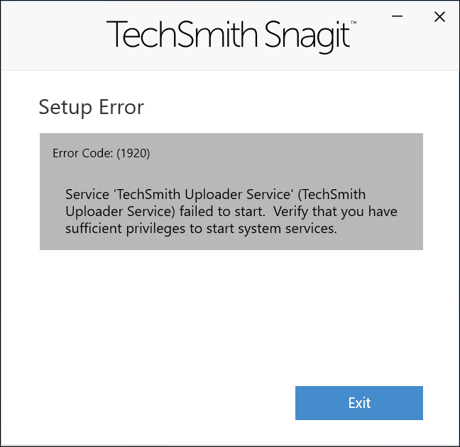The Snagit installation fails with the error "Error Code: (1920) Service 'Techsmith Uploader Service' (Techsmith Uploader Service) failed to start. Verify that you have sufficient privileges to start system services.