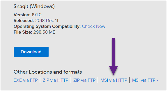 1. Download the MSI installer for the version of Snagit you are trying to install. The MSI can be downloaded from our Downloads Page by selecting the version from the dropdown, then click the MSI via HTTP download link.