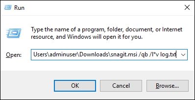 If the MSI were saved to the Downloads folder, the command would look like: C:\Users\YOURUSERNAME\Downloads\snagit.msi /qb /l*v log.txt