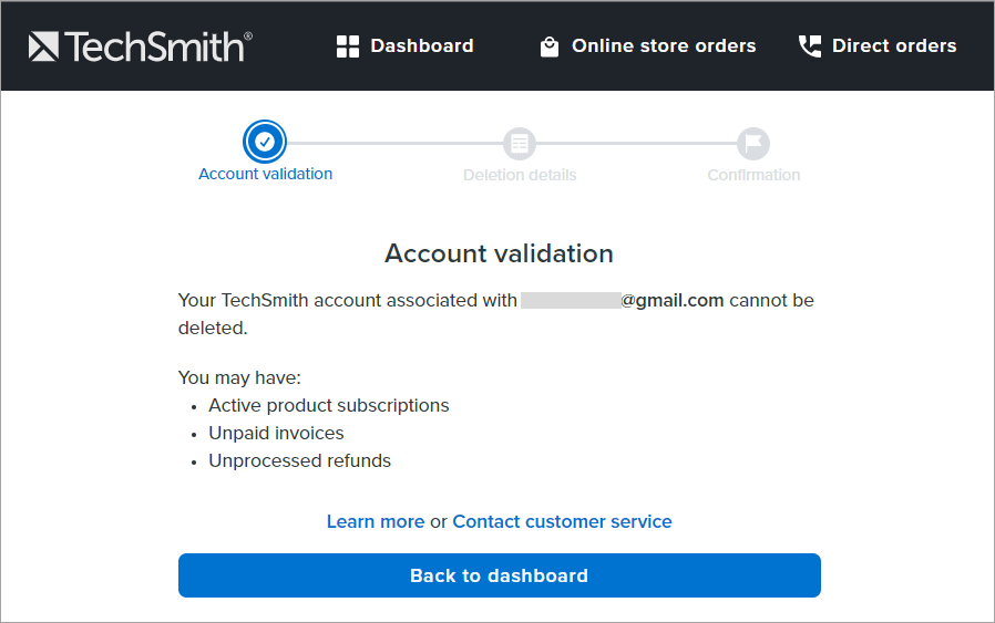 After you start account deletion at manage.techsmith.com, the system checks if you have: