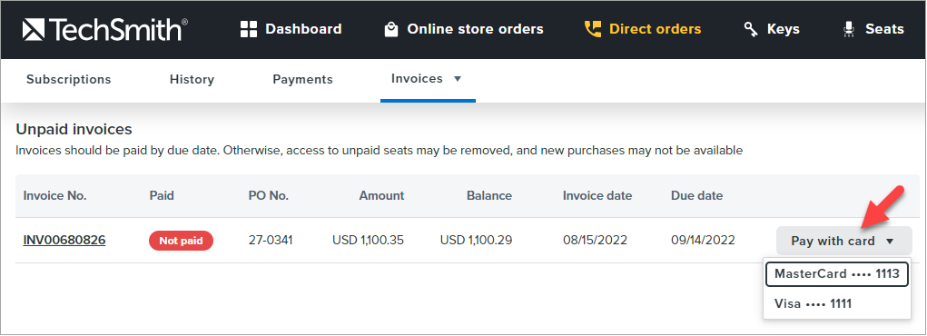 - At manage.techsmith.com, go to Direct orders > Invoices > Unpaid invoices.