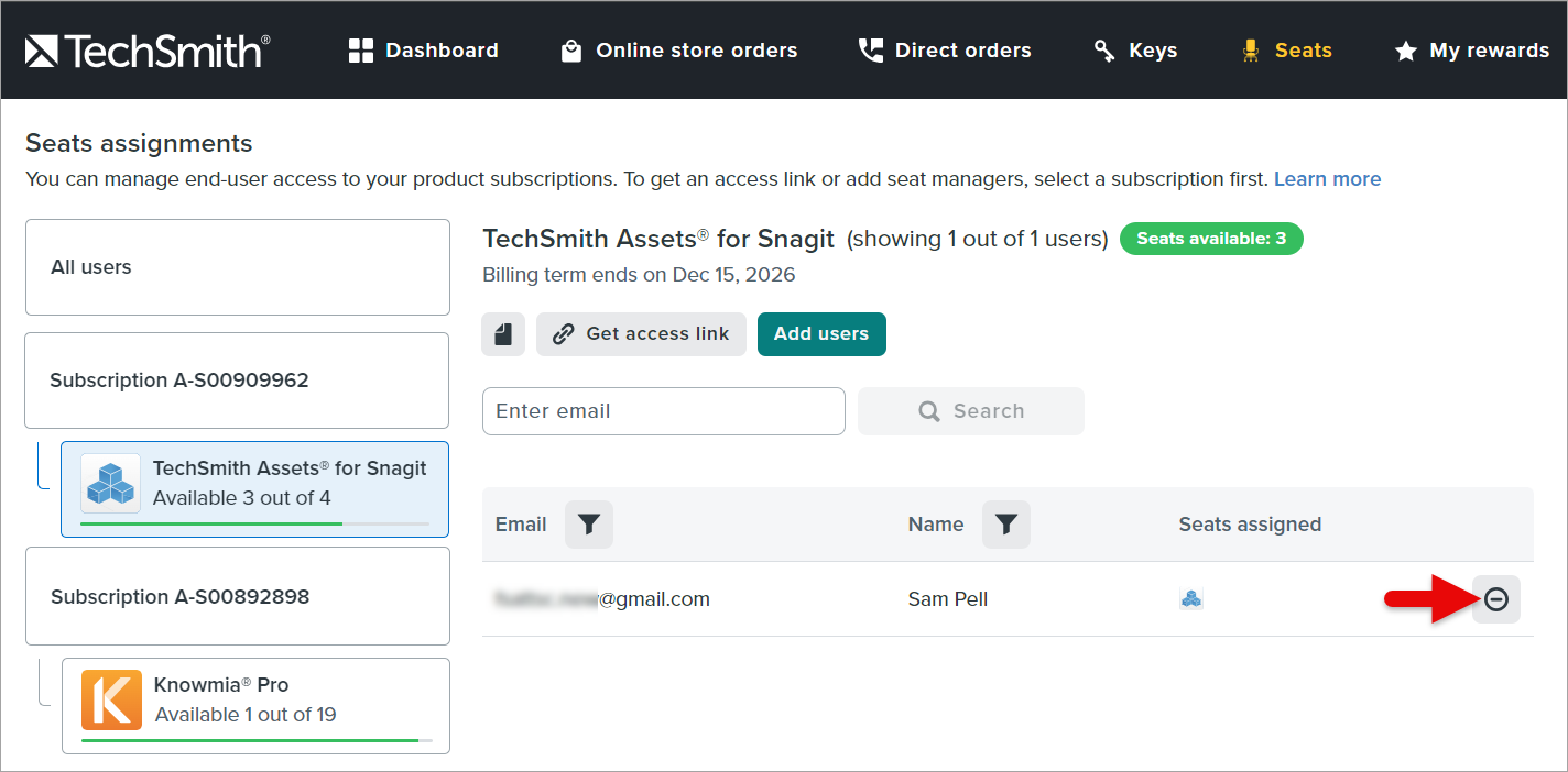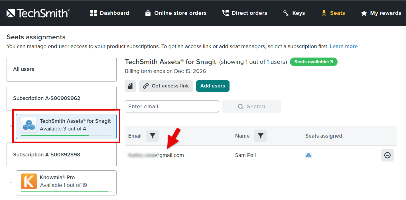 - On the Seats page, the product that you selected should be highlighted, and you can view who already has access to this particular product.