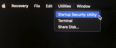 - The Startup Security Utility can be accessed from the Utilities menu. Utilities > Startup Security Utility.