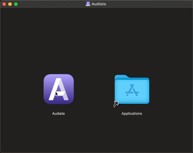- The installer window appears. Drag the Audiate icon into the Applications folder.