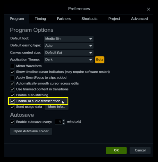 You will need to enable Speech to Text by going to Edit > Preferences... and selecting the "Enable AI audio transcription" option.