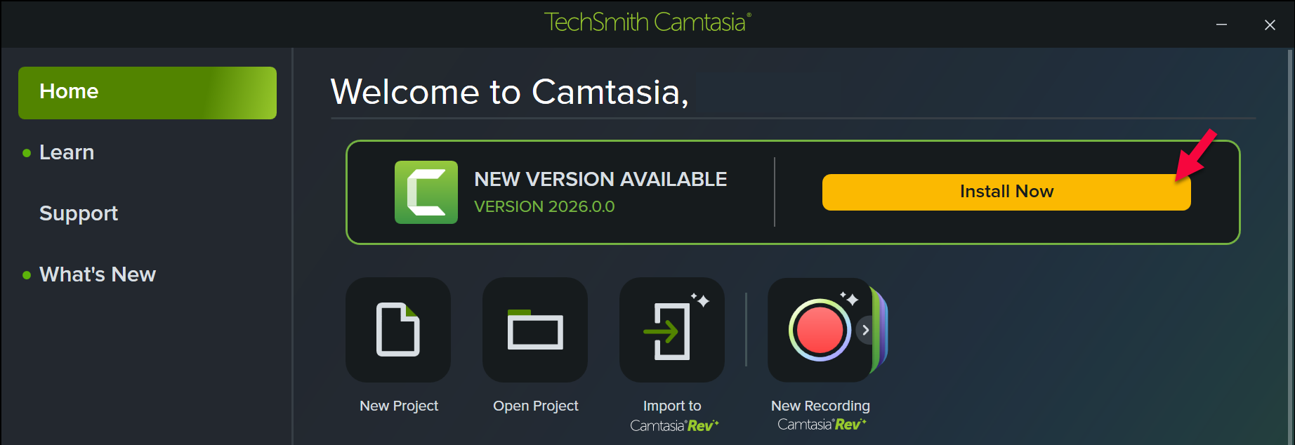 To access the included Audiate features, you'll need to have Camtasia 2025.0.3 or later installed. It's recommended that you first open Camtasia Editor and confirm you've installed any updates. You should see any available updates in the Camtasia Editor home screen.