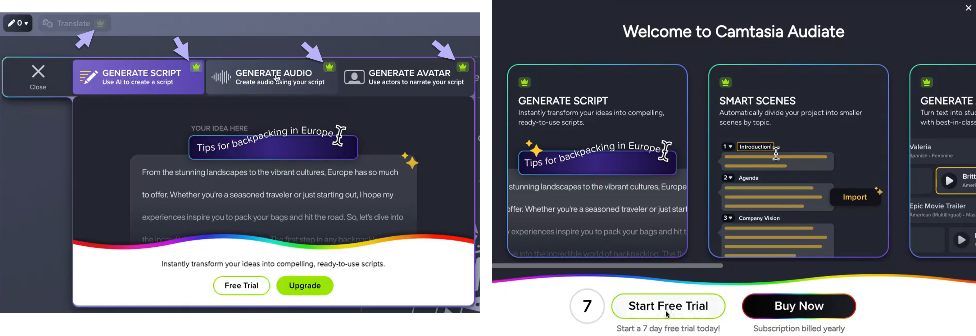 Features that are not available will be labeled with a green crown icon . If you try to use these features the software will prompt you to start a free trial or upgrade to unlock. If you're interested in unlocking more features, you can upgrade your Camtasia plan or purchase a standalone Audiate subscription.