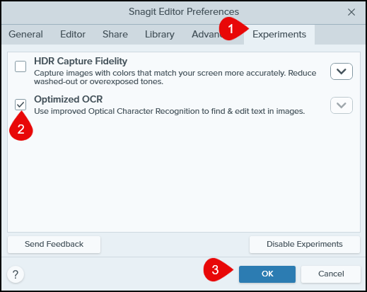 Option 2: Turn on Experimental Feature for Optimized OCR functionality. (Snagit 2026 & later Only)