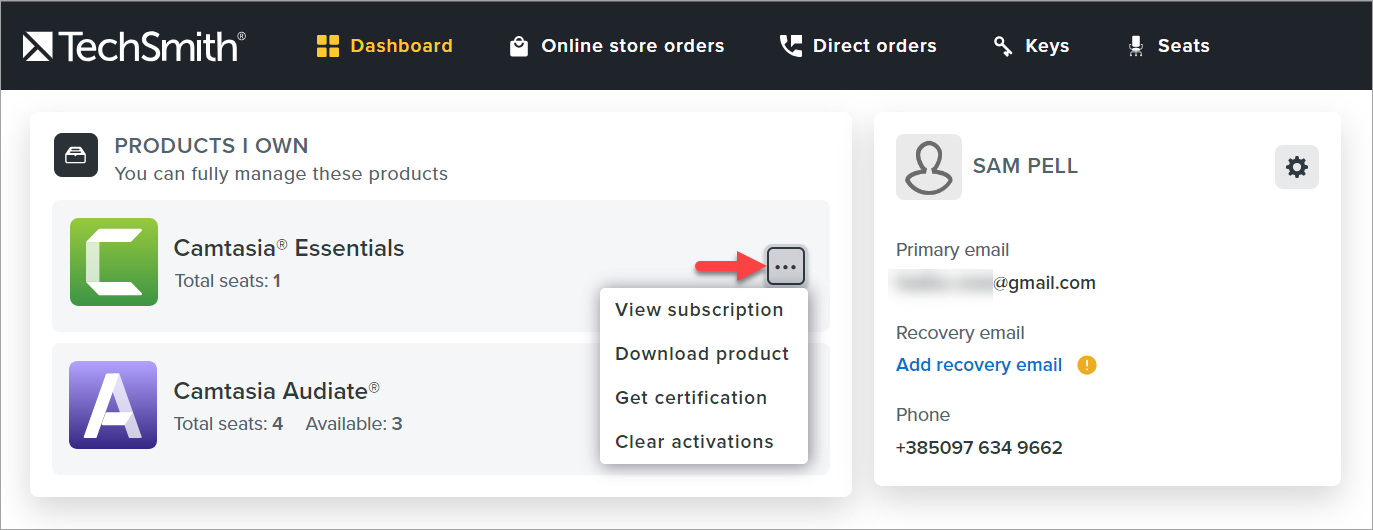 Review your Snagit or Camtasia purchase & make changes to it. If you want someone else to manage the product, please submit a ticket. |