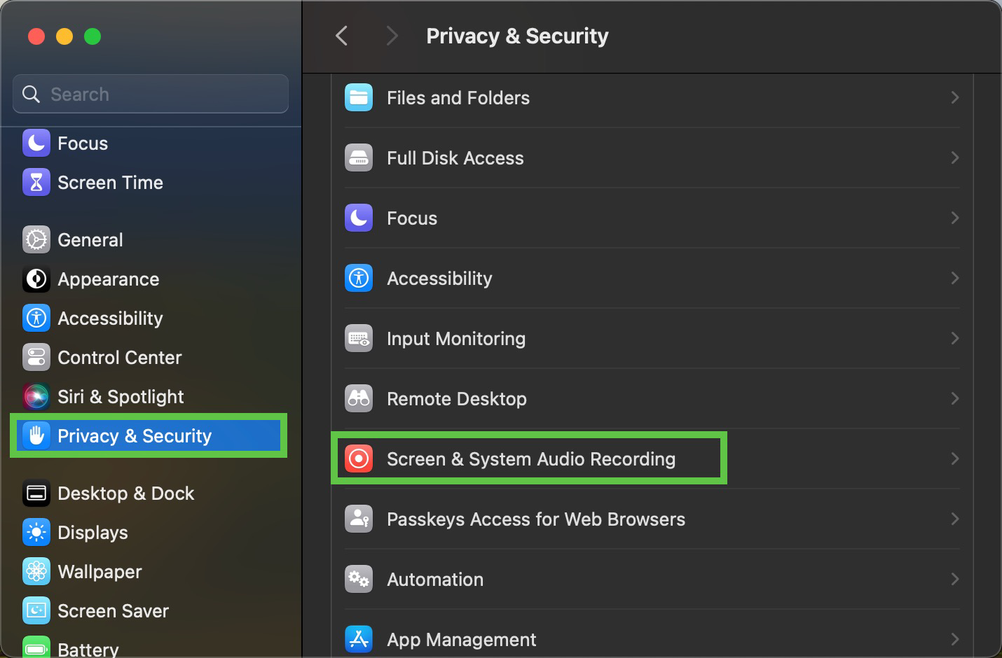 - Abra Preferencias del sistema > Privacidad y seguridad > Grabación de pantalla y audio del sistema.