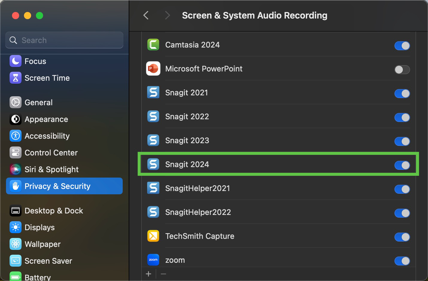 Cualquier actualización de macOS puede hacer que esta configuración se desactive. Si macOS se ha actualizado recientemente y tiene este problema, verifique esta configuración para asegurarse de que Snagit esté habilitado (Si usa Snagit 2022 o anterior, asegúrese de que SnagitHelper también esté habilitado).