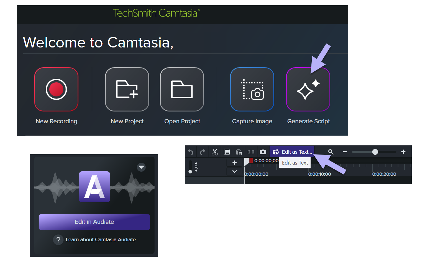 Esta es una instalación separada de Camtasia Editor y Audiate verificará automáticamente que tengas Camtasia instalado antes de desbloquear las funciones incluidas.