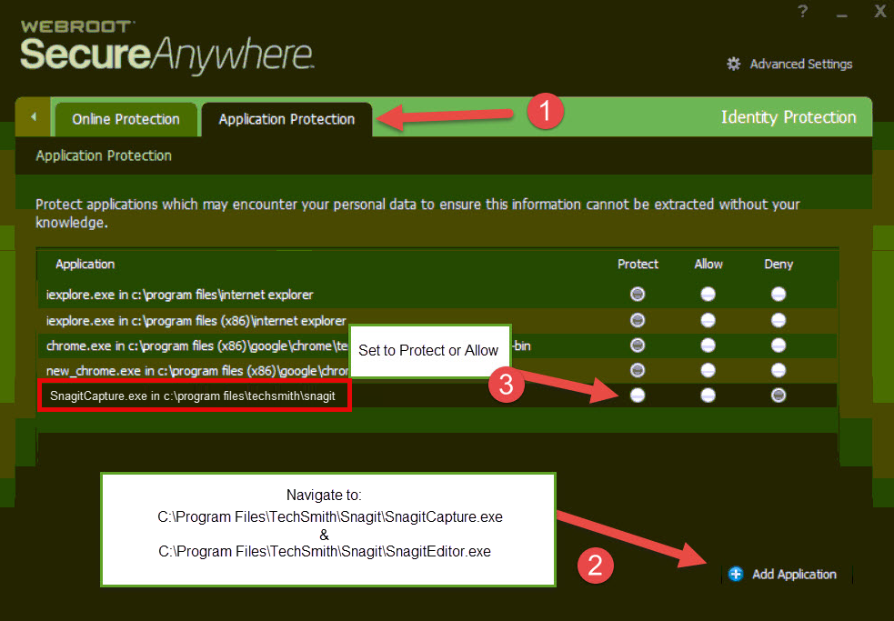 - Allez dans l'onglet Protection des applications, puis cliquez sur Ajouter une application en bas à droite. Ajoutez à la fois SnagitCapture.exe et SnagitEditor.exe via le chemin indiqué dans la capture d'écran ci-dessous. Ensuite, définissez sur Autoriser ou Protéger.