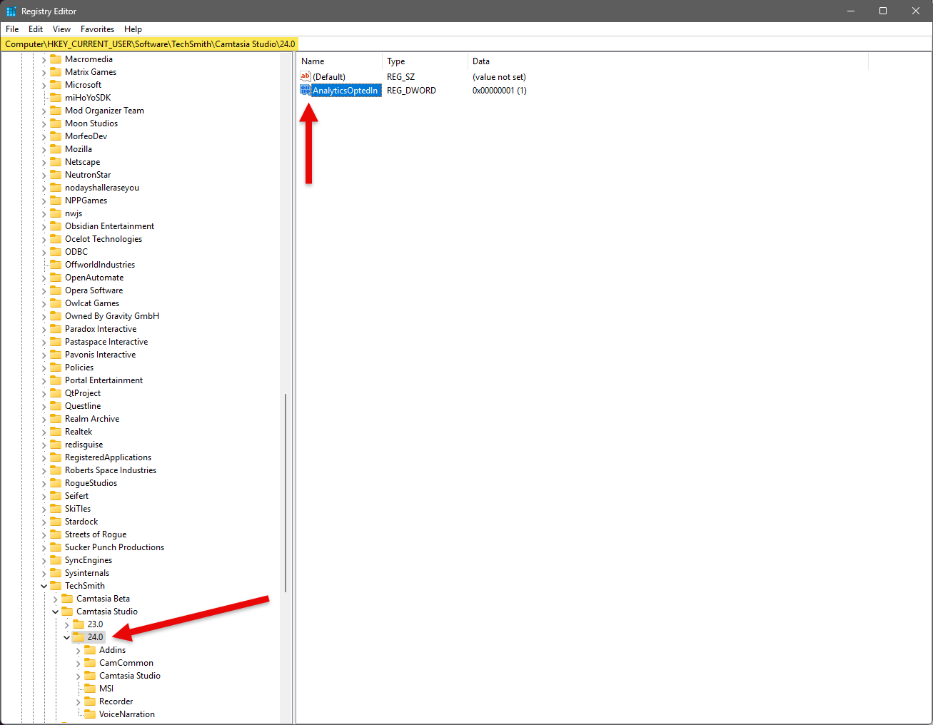- Camtasia 2024: HKEY_CURRENT_USER\Software\TechSmith\Camtasia Studio\24.0