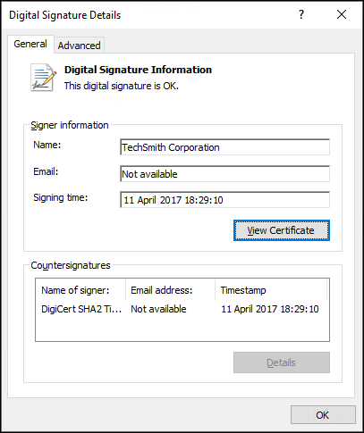 - 一覧から署名を選択して「詳細」をクリック します。この詳細ウィンドウに、このデジタル署名の検証状況が表示されるはずです。