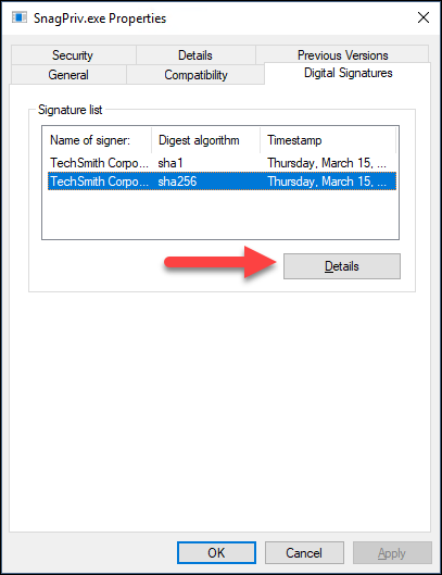 - SnagPriv.exe を検出し、右クリックして 「プロパティ」>「デジタル署名」を選択します。