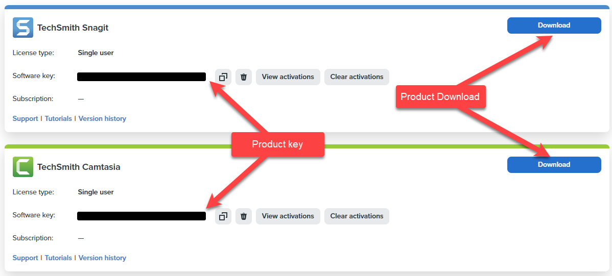*SnagitまたはCamtasiaのキーが表示されない場合は、以下の理由でTechSmithアカウントに保存されていない可能性があります: