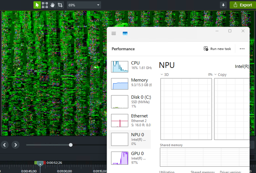 Intel Ultra 5 および Intel Ultra 7 プロセッサにおいて、Camtasia Editor のレンダリングに影響を与える問題が確認されています。レンダリングされたビデオに「緑色のアーティファクト」として表示されることが多く、Intel Ultra 5 または Ultra 7 プロセッサを搭載したマシンで Camtasia Editor を使用するとパフォーマンスの問題が発生します。以下の画像は、その例を示しています: