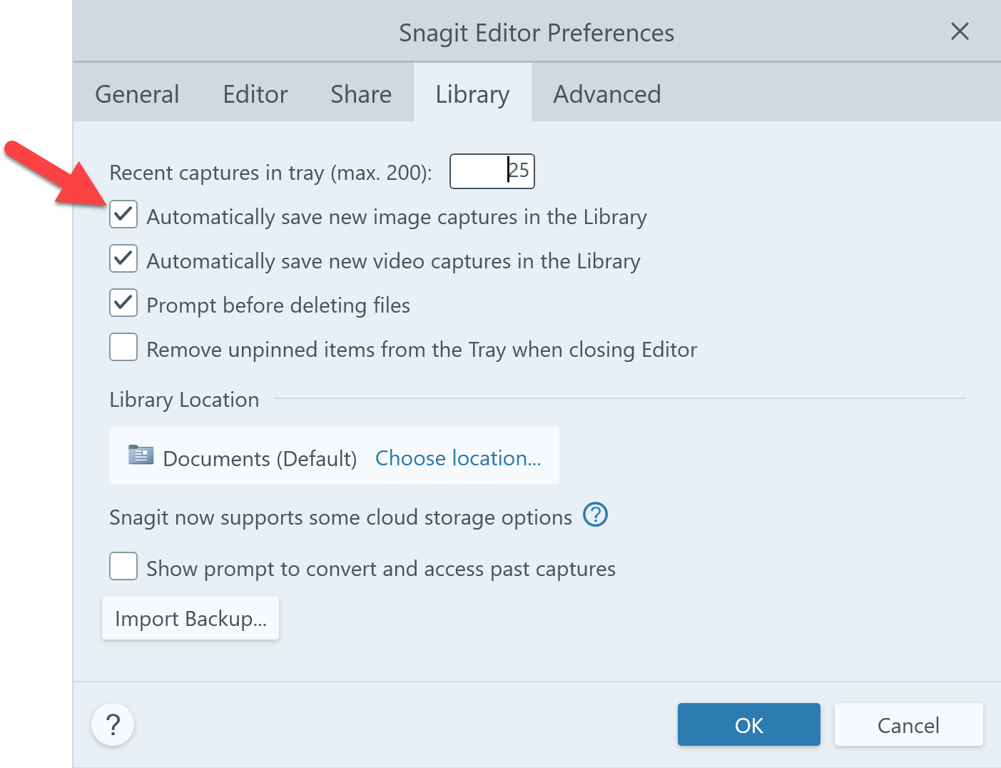 - 「新しい画像キャプチャを自動的にライブラリに保存する」のチェックを外します。