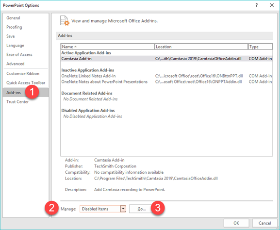 Se esta opção estiver desabilitada e não puder ser selecionada, isso indica que o PowerPoint é uma versão de 32 bits ou não é detectado pelo Camtasia.