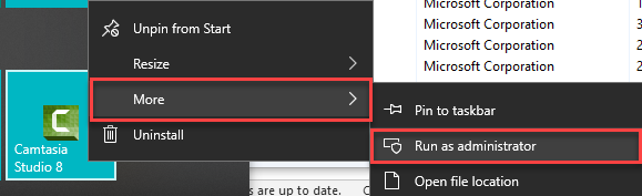 - Clique com o botão direito em Camtasia no atalho do menu iniciar e selecione Mais > Executar como Administrador.