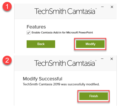 - Selecione Habilitar Complemento do Camtasia para Microsoft PowerPoint. Em seguida, clique em Modificar. Quando a modificação estiver completa, clique em Concluir.