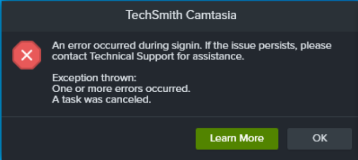 O Camtasia Editor está exibindo uma mensagem de erro ao tentar iniciar o programa. Veja abaixo a lista de possíveis erros e como solucioná-los.