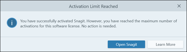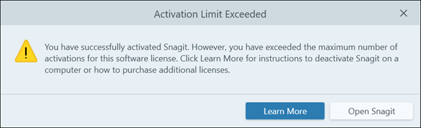 Isso significa que a chave de software foi usada duas vezes para ativar o Snagit. Uma chave de software para usuário único pode ser usada em até duas máquinas para o mesmo usuário. Você não precisa tomar nenhuma ação neste momento, mas se desejar saber mais sobre ativação de licenças, clique em Saiba Mais na mensagem.