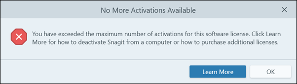 Isso significa que esta chave de software foi usada mais de duas vezes para ativar o Snagit e está em violação do nosso EULA (Contrato de Licença de Usuário Final). Uma chave de software para usuário único pode ser usada somente em até duas máquinas para o mesmo usuário. A chave de software não pode mais ser usada para ativar o Snagit sem ação. Por favor, clique em Saiba Mais na mensagem para saber quais passos devem ser tomados.